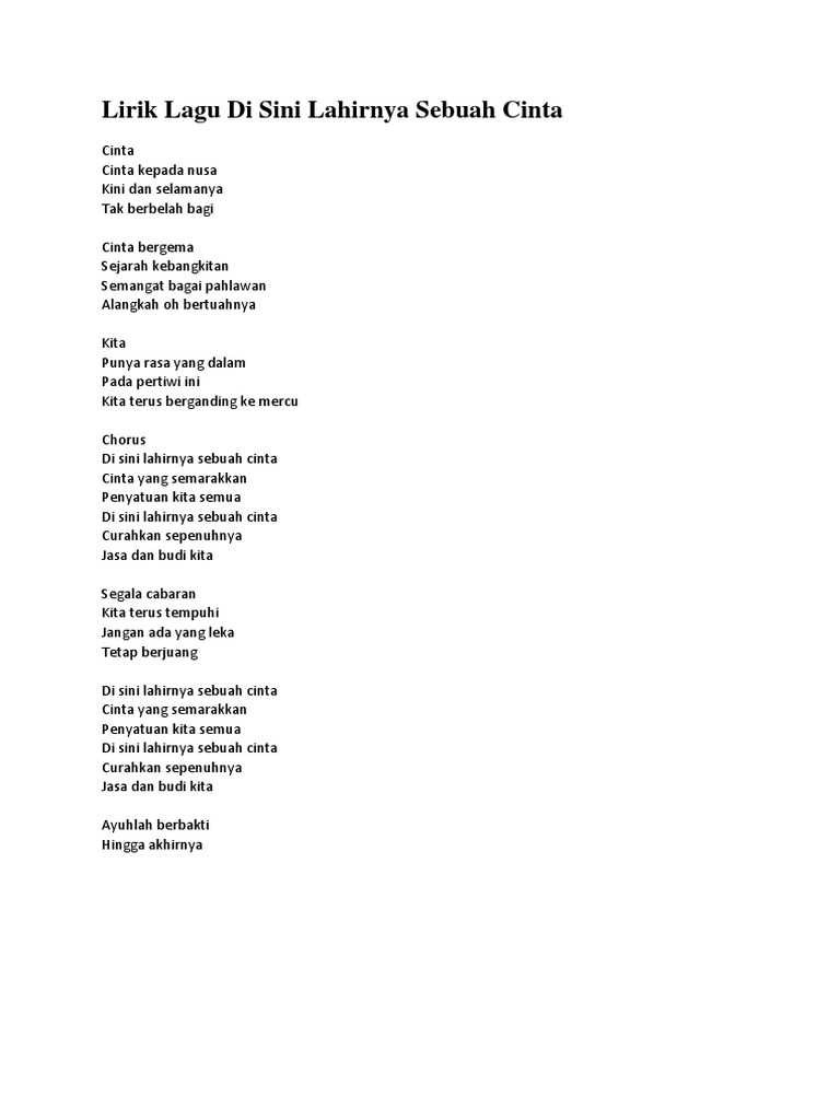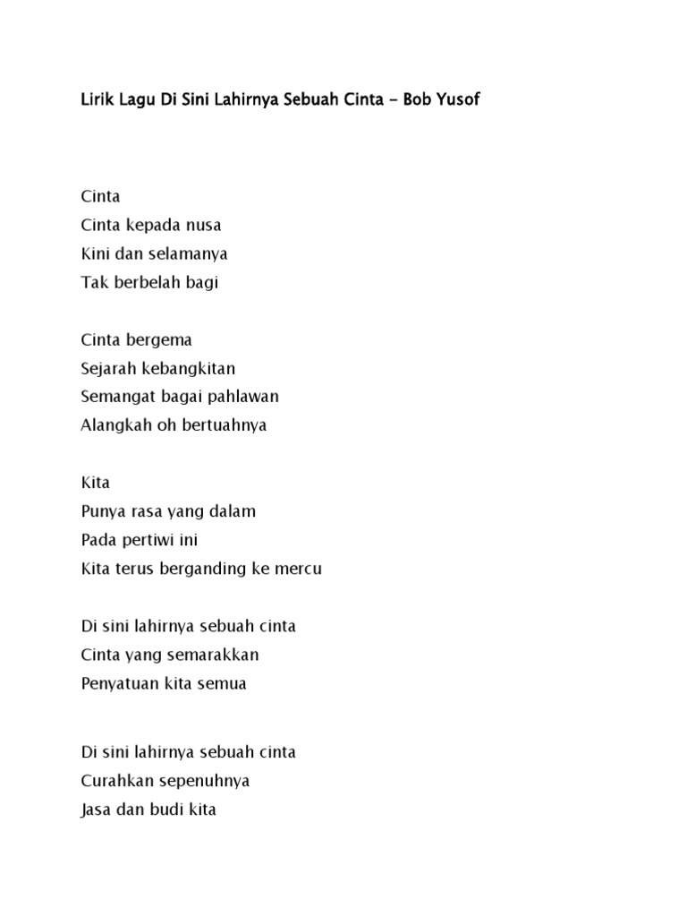 Lirik Lagu Di Sini Lahirnya Sebuah Cinta - Bob Yusof Cinta Cinta kepada nusa Kini dan selamanya Tak berbelah bagi Cinta bergema Sejarah kebangkitan Semangat bagai pahlawan Alangkah oh bertuahnya Kita Punya rasa yang dalam Pada pertiwi ini Kita terus berganding ke mercu Korus Di sini lahirnya sebuah cinta Cinta yang. Dengarkan lagu patriotik malar segar berjudul Warisan ciptaan Allahyarham Syed Haron Syed Ahmad nyanyian asal Allahyarham Datuk Sudirman Hj. Sila tulis satu entri dengan tajuk Malaysia di sini lahirnya sebuah cinta lebih 300 ratus perkataan.